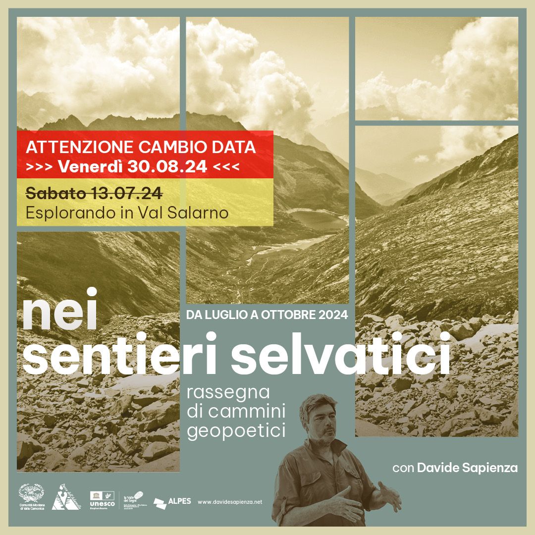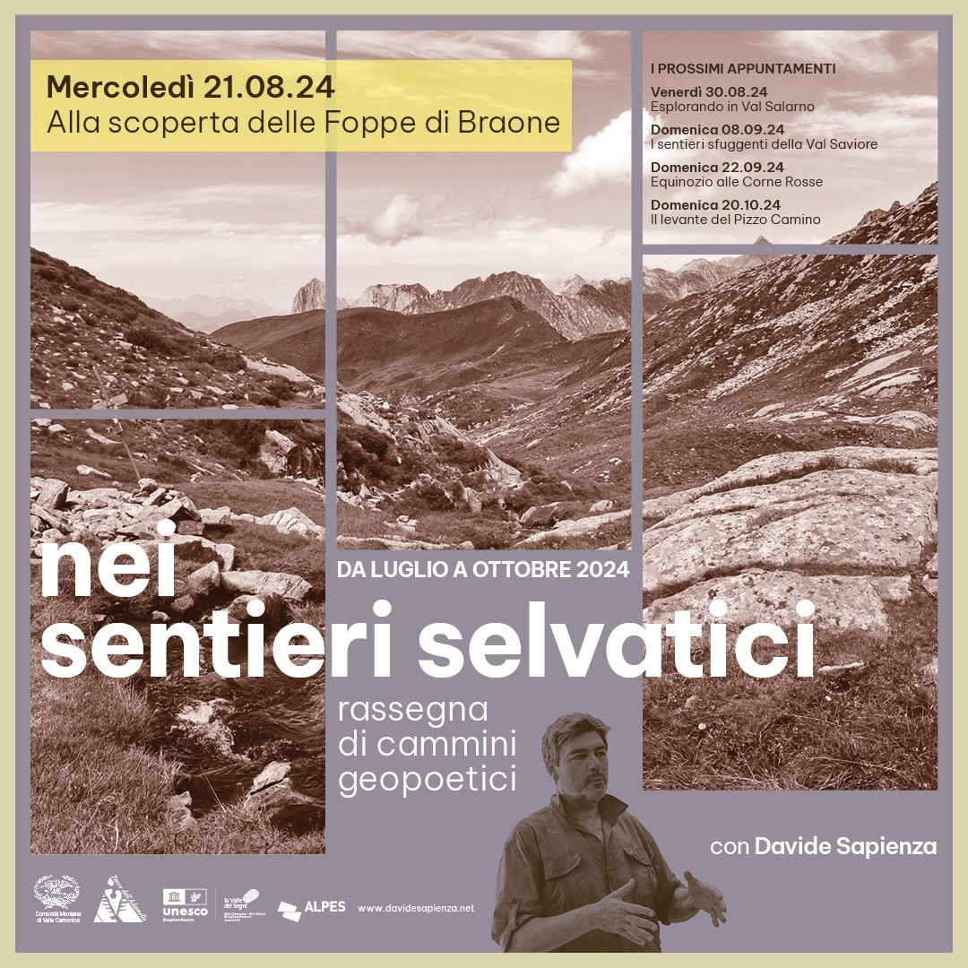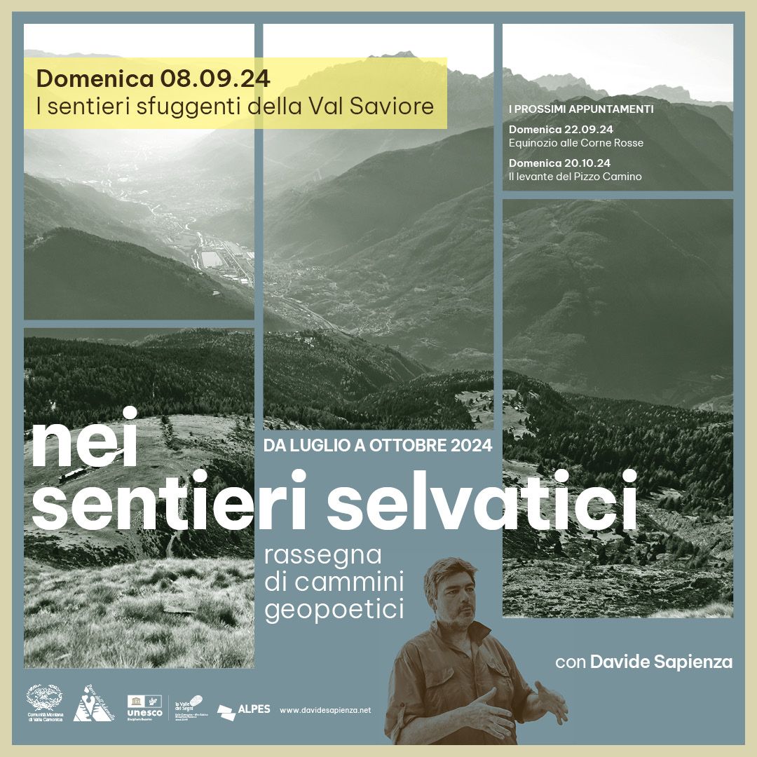Nei Sentieri Selvatici è il titolo della rassegna di cammini geopoetici che il Parco Adamello affida allo scrittore Davide S. Sapienza: cinque giornate in cammino da metà agosto a metà ottobre, per un’iniziativa che desidera valorizzare il legame tra geografia e poetica nell’ambiente alpino del Parco dell’Adamello e della Riserva della Biosfera Valle Camonica-Alto Sebino, lungo più mesi tra l’estate e l’autunno del 2024.