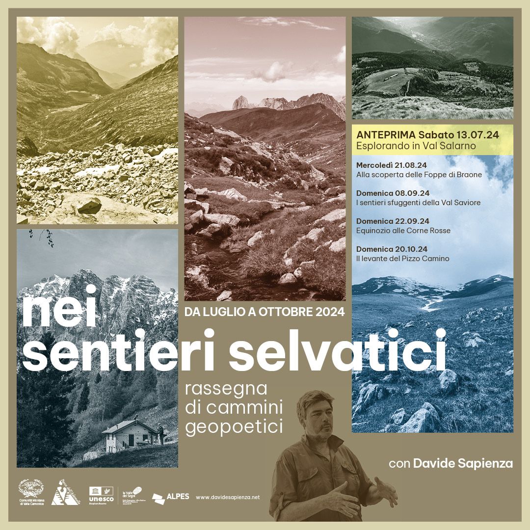 Tra le iniziative proposte c’è l'organizzazione della rassegna "Nei Sentieri Selvatici", in collaborazione con l'officina culturale Alpes e Davide Sapienza, scrittore e creatore dei cammini geopoetici, una modalità di esplorazione della geografia dei territori supportata e accompagnata da incursioni letterarie e poetiche. Tra luglio e ottobre sono programmate cinque lunghe escursioni: cinque percorsi scelti per sottolineare la straordinaria varietà che la storia naturale e culturale della Valle Camonica ha impresso al suo paesaggio, che offriranno ai partecipanti un'esperienza unica di connessione con la natura e la cultura locale, esplorando luoghi dove il selvatico rintraccia percezioni e visioni riflesse dal nostro modo di essere.