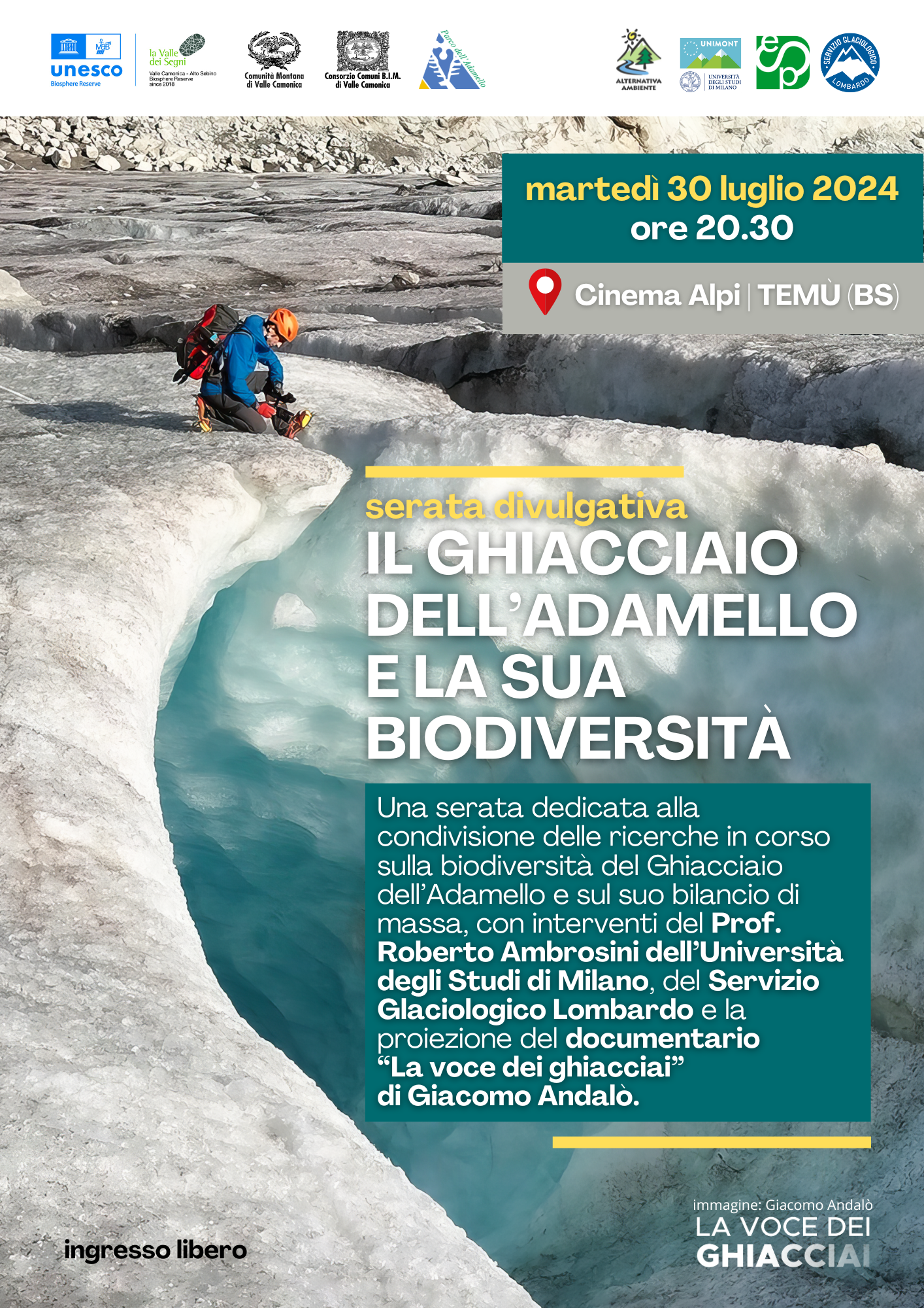 Con intreventi del Prof. Roberto Ambrosini dell'Università degli Studi di Milano, di SGL - Servizio Glaciologico Lombardo e la proiezione del film "La voce dei ghiacciai" di Giacomo Andalò.
