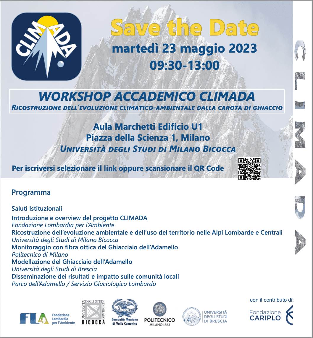 Una mattina dedicata ai progressi del progetto ClimADA, in cui interverranno i vari soggetti del partenariato coordinato da Fondazione Lombardia per l’Ambiente e composto dalla Comunità Montana di Valle Camonica, Università degli Studi di Milano Bicocca, Politecnico di Milano e Università degli Studi di Brescia.