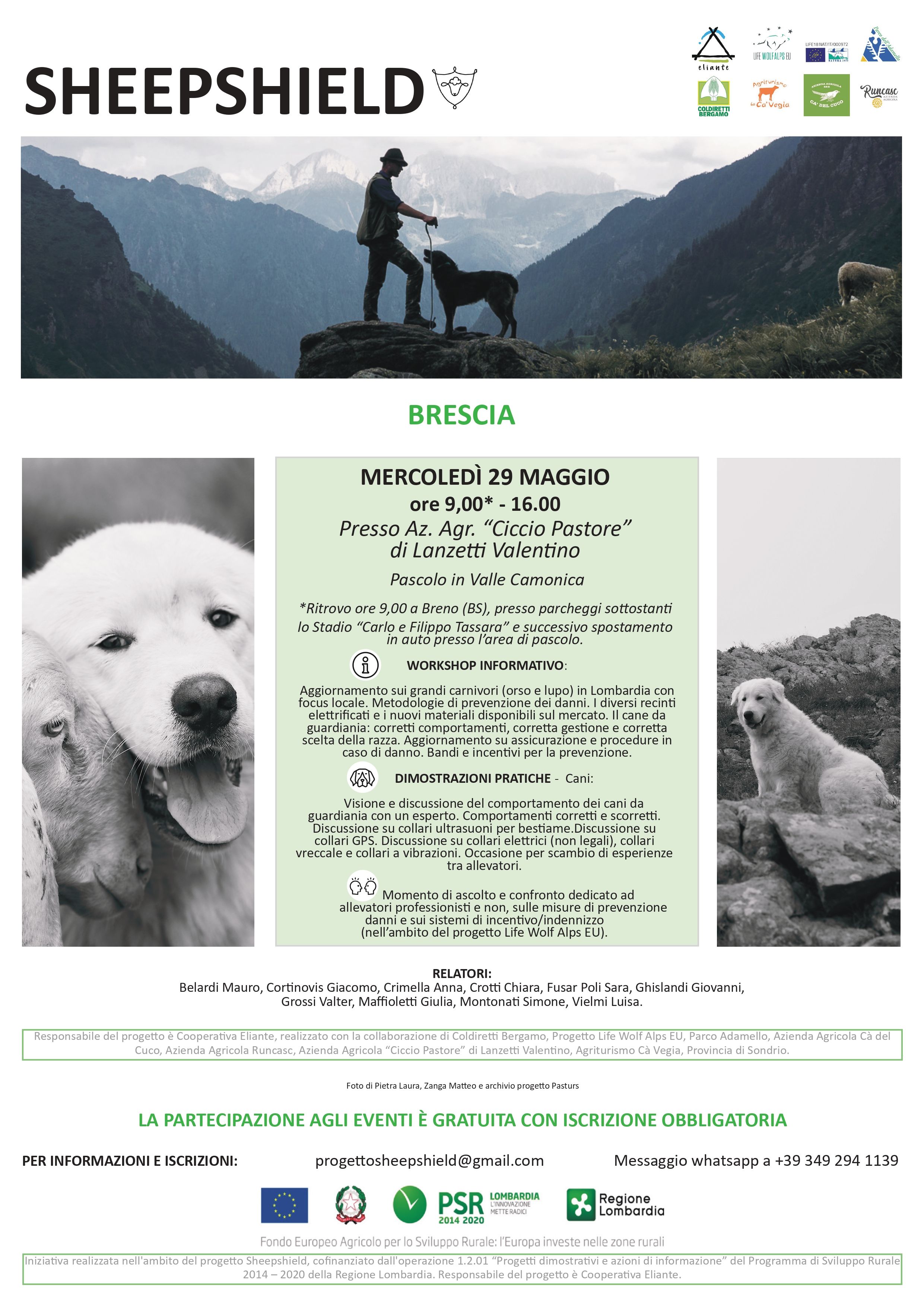 L’incontro, che si terrà il 29 maggio 2024 presso i pascoli di Breno, è realizzato nell’ambito della collaborazione fra i progetti Life Wolfalps EU e Sheepshield, e si configura come un incontro informativo, con dimostrazioni pratiche sull’utilizzo dei sistemi di prevenzione e momenti di ascolto e confronto.