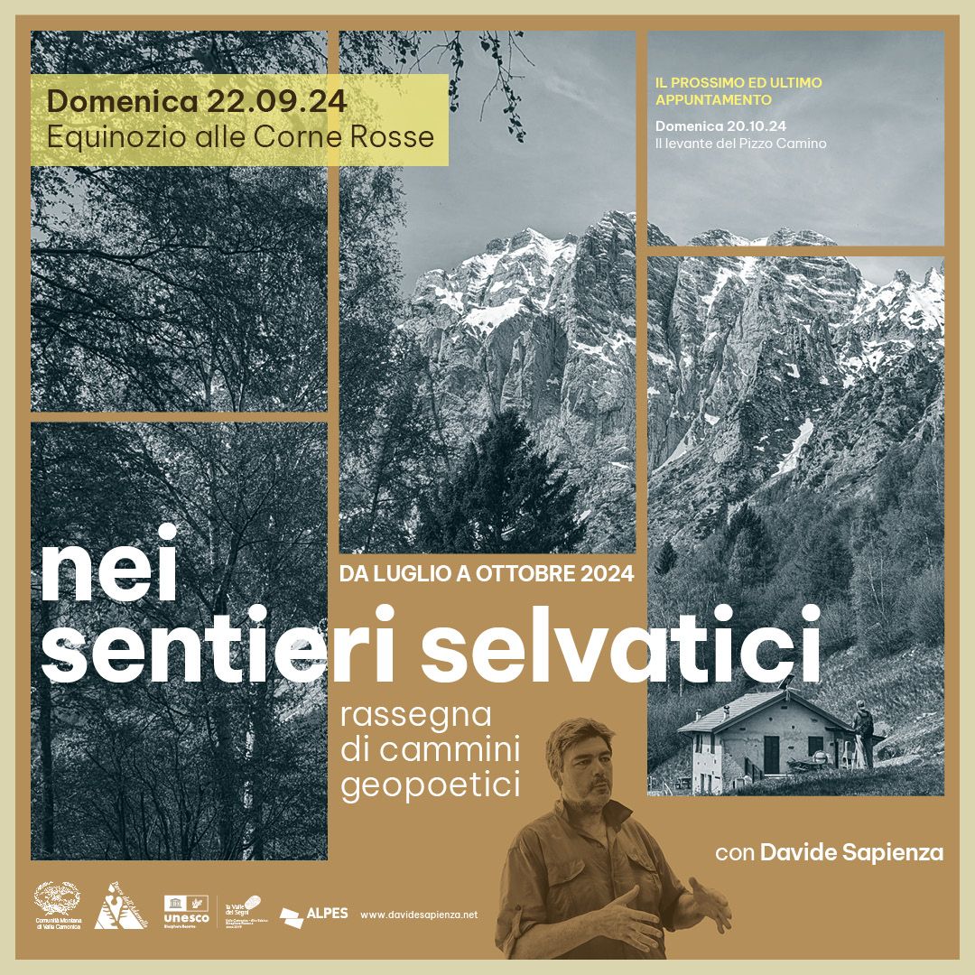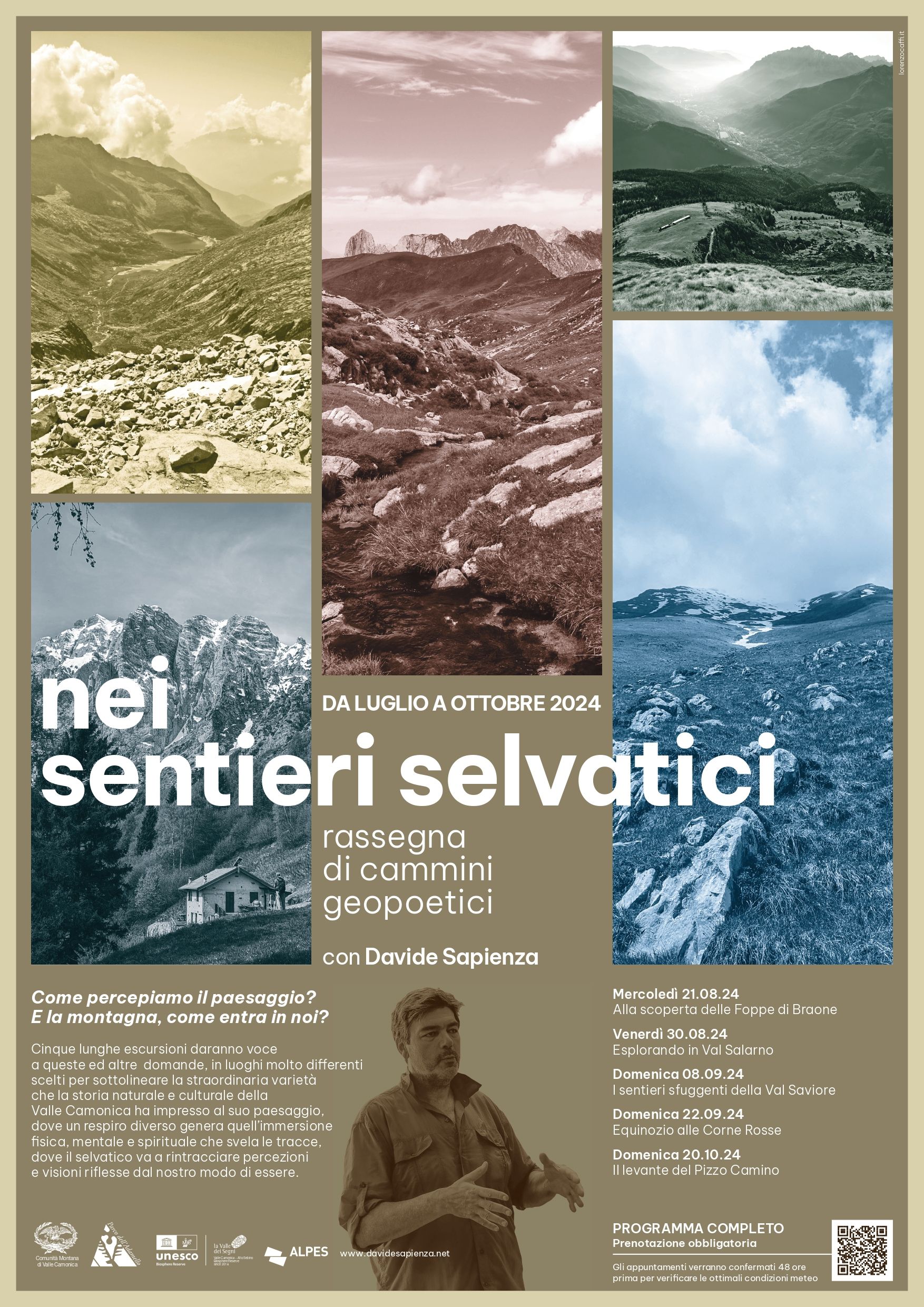 Nei Sentieri Selvatici è il titolo della rassegna di cammini geopoetici che il Parco Adamello affida allo scrittore Davide S. Sapienza: cinque giornate in cammino da metà agosto a metà ottobre, per un’iniziativa che desidera valorizzare il legame tra geografia e poetica nell’ambiente alpino del Parco dell’Adamello e della Riserva della Biosfera Valle Camonica-Alto Sebino, lungo più mesi tra l’estate e l’autunno del 2024.