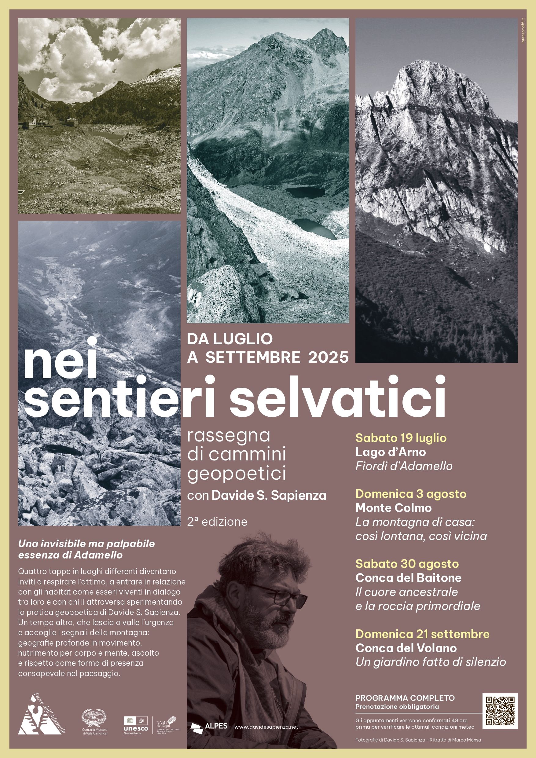 Quattro tappe in luoghi differenti diventano inviti a respirare l’attimo, a entrare in relazione con gli habitat come esseri viventi in dialogo tra loro e con chi li attraversa sperimentando la pratica geopoetica di Davide S. Sapienza. Un tempo altro, che lascia a valle l’urgenza e accoglie i segnali della montagna: geografie profonde in movimento, nutrimento per corpo e mente, ascolto e rispetto come forma di presenzaconsapevole nel paesaggio.